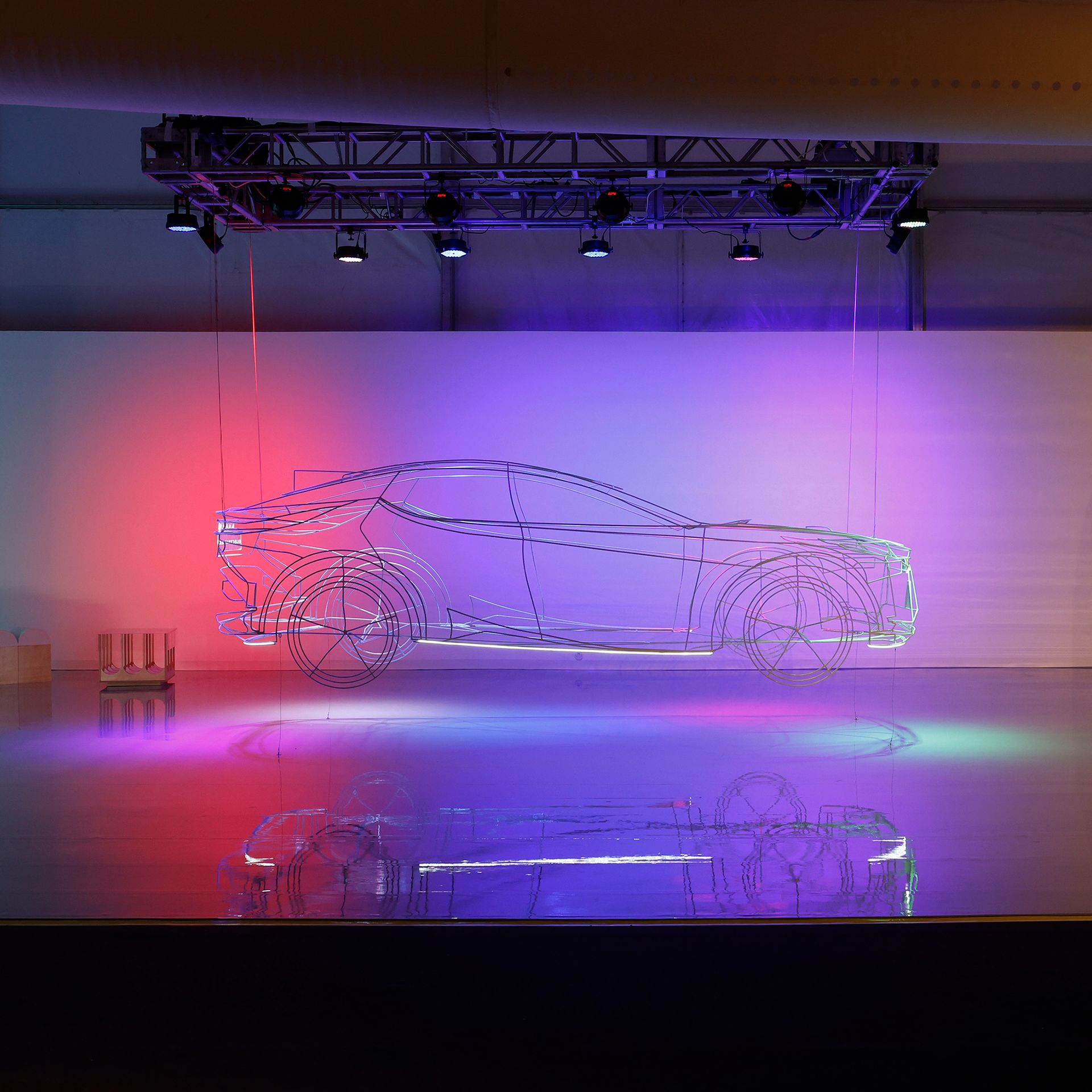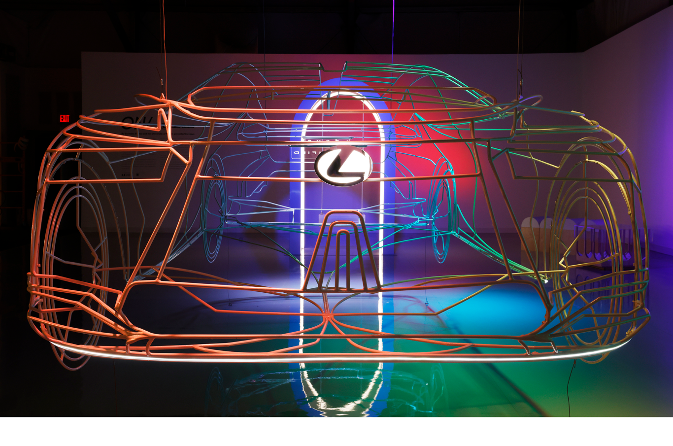 The installation is centered around a precisely-to-scale, three-dimensional sculptural rendition of the LF-Z Electrified Concept car rendered in steel and illuminated with embedded LED lighting; the frame of the car glows and is suspended just above the ground, a vision of a more sustainable future coming into focus. Two swings anchor the display, each suspended within illuminated arches in a nod to the classical architecture that is both foundational to the design of civic infrastructure and central to the University of Miami’s curriculum, alluding to a gateway between our present and the possibilities of the future.