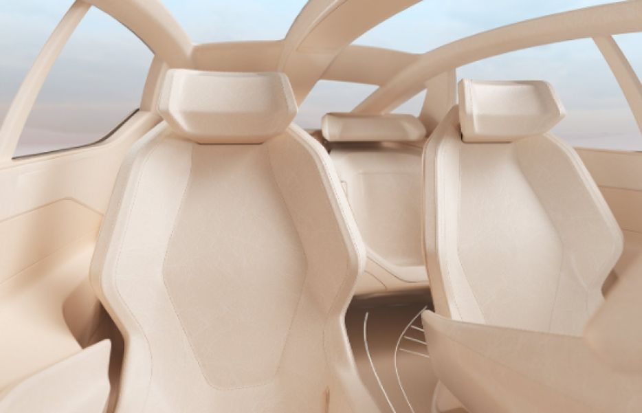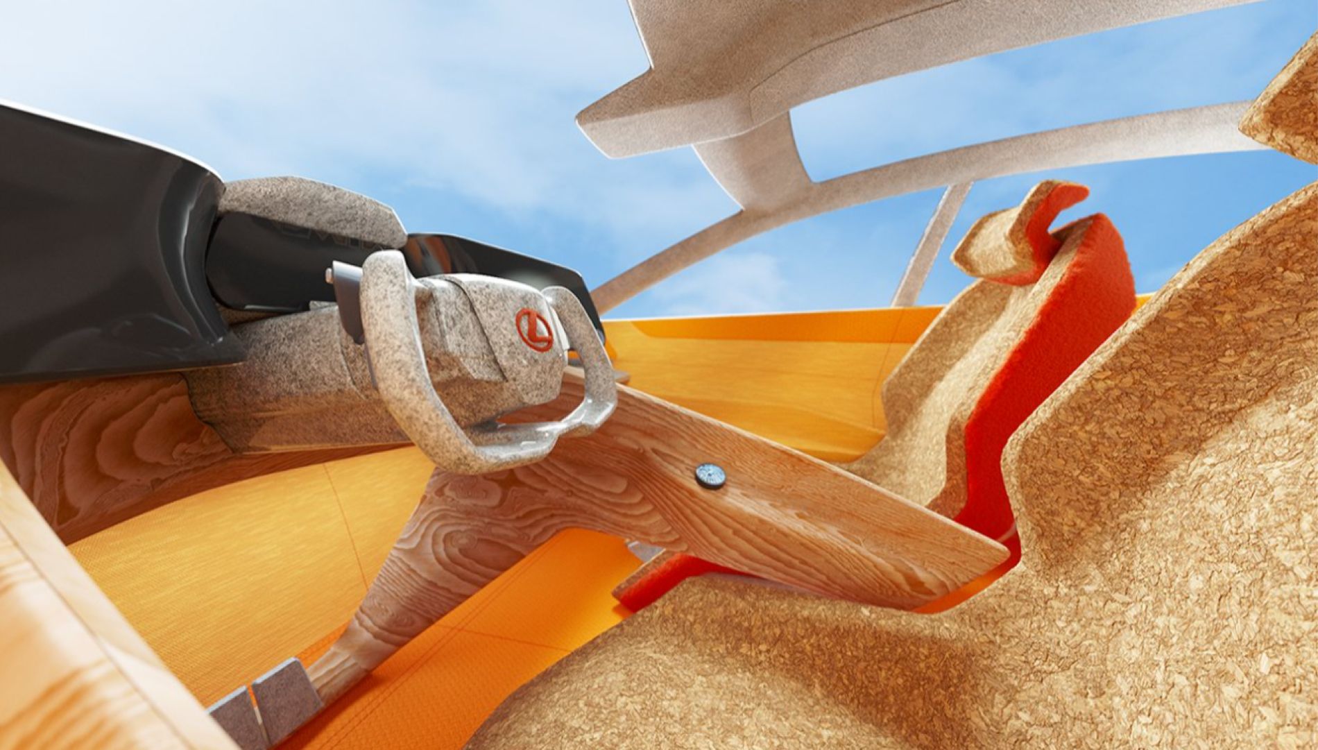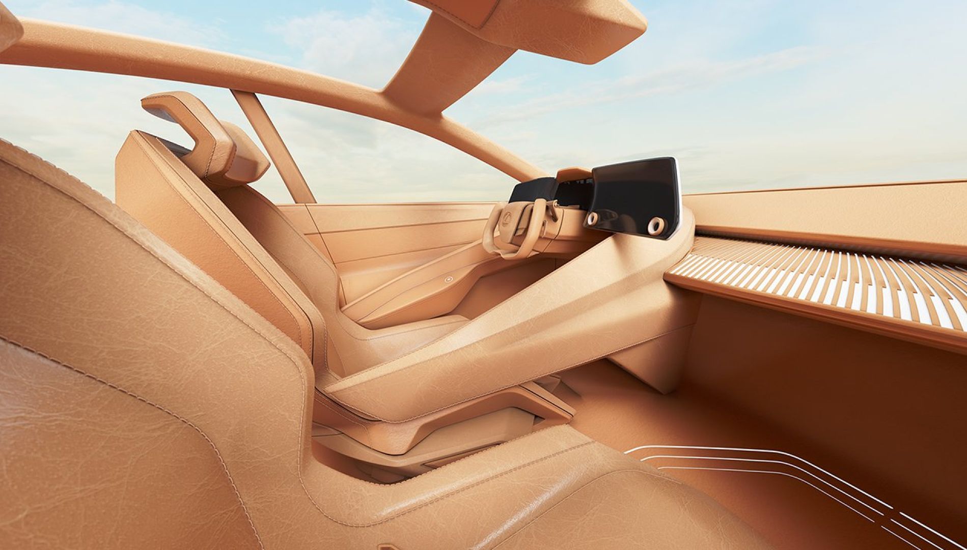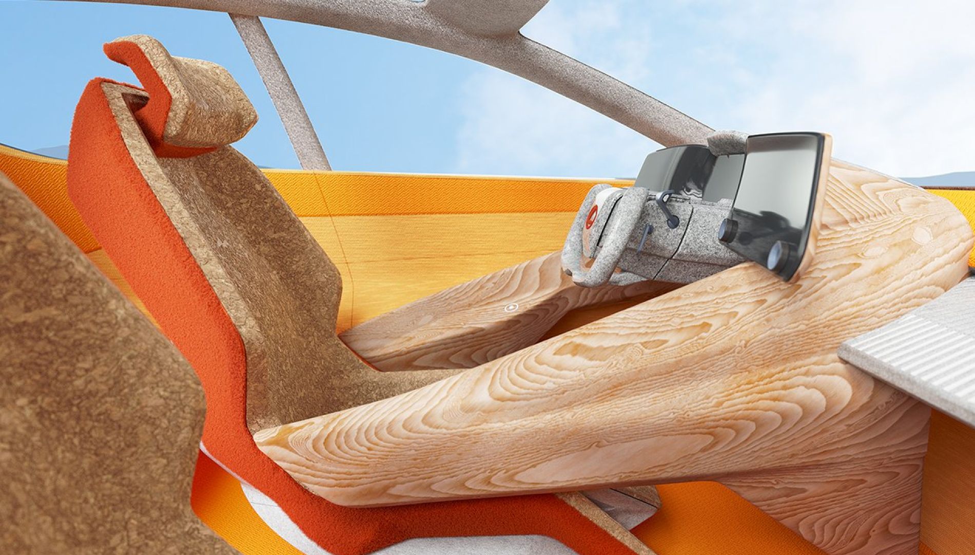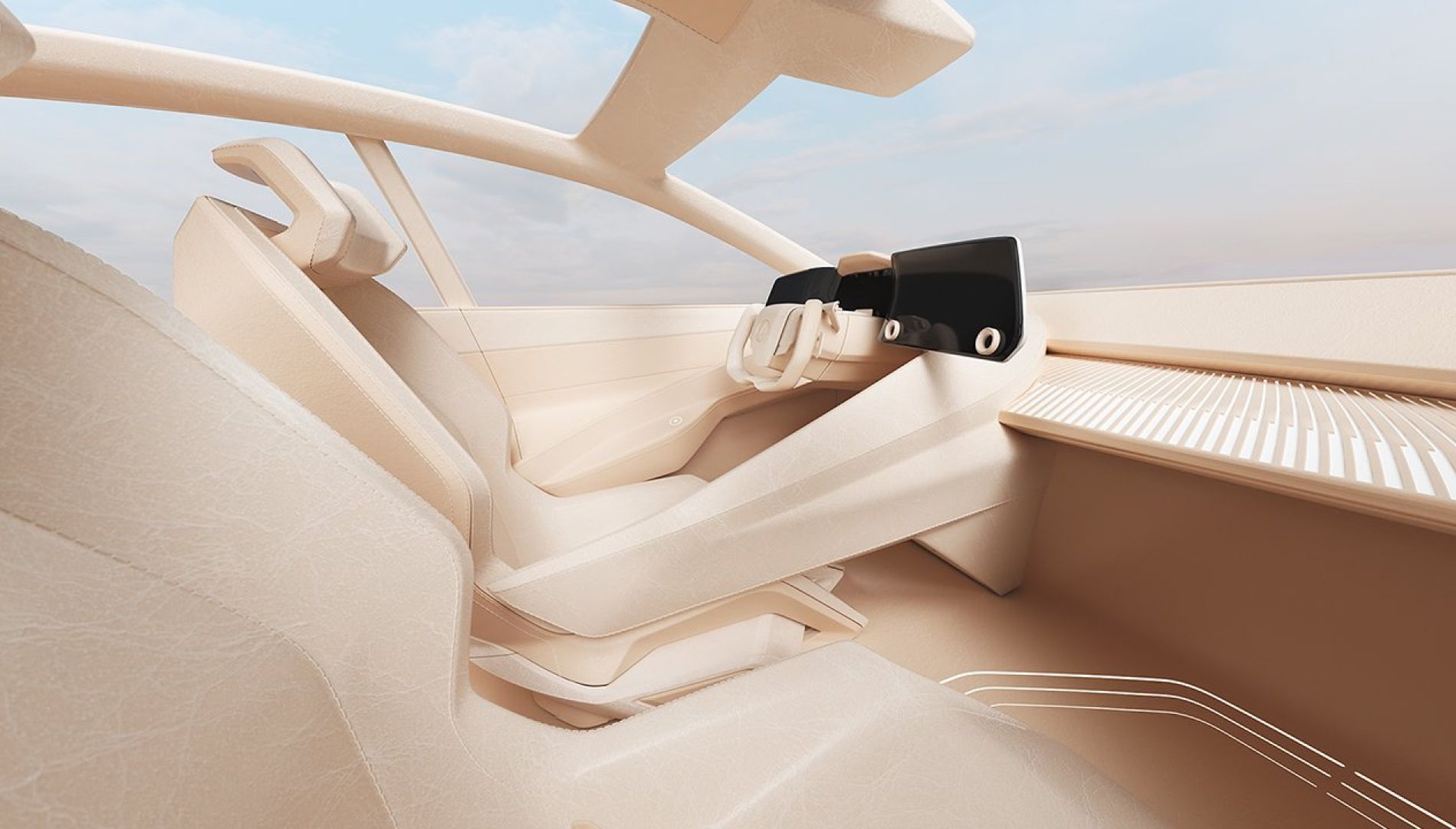 The concept uses colors inspired by sandstone landscapes and other natural tones, setting aside traditionally futuristic materials in favor of natural materials like cedar, cork and granite. These natural materials sit alongside textiles and patterns that reference Bembury’s background in sneaker design, such as a “hairy” suede used on the seatbacks, and a fingerprint motif that is often found in the designer’s work, applied here for a personalized control panel.